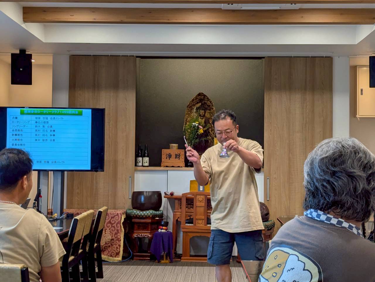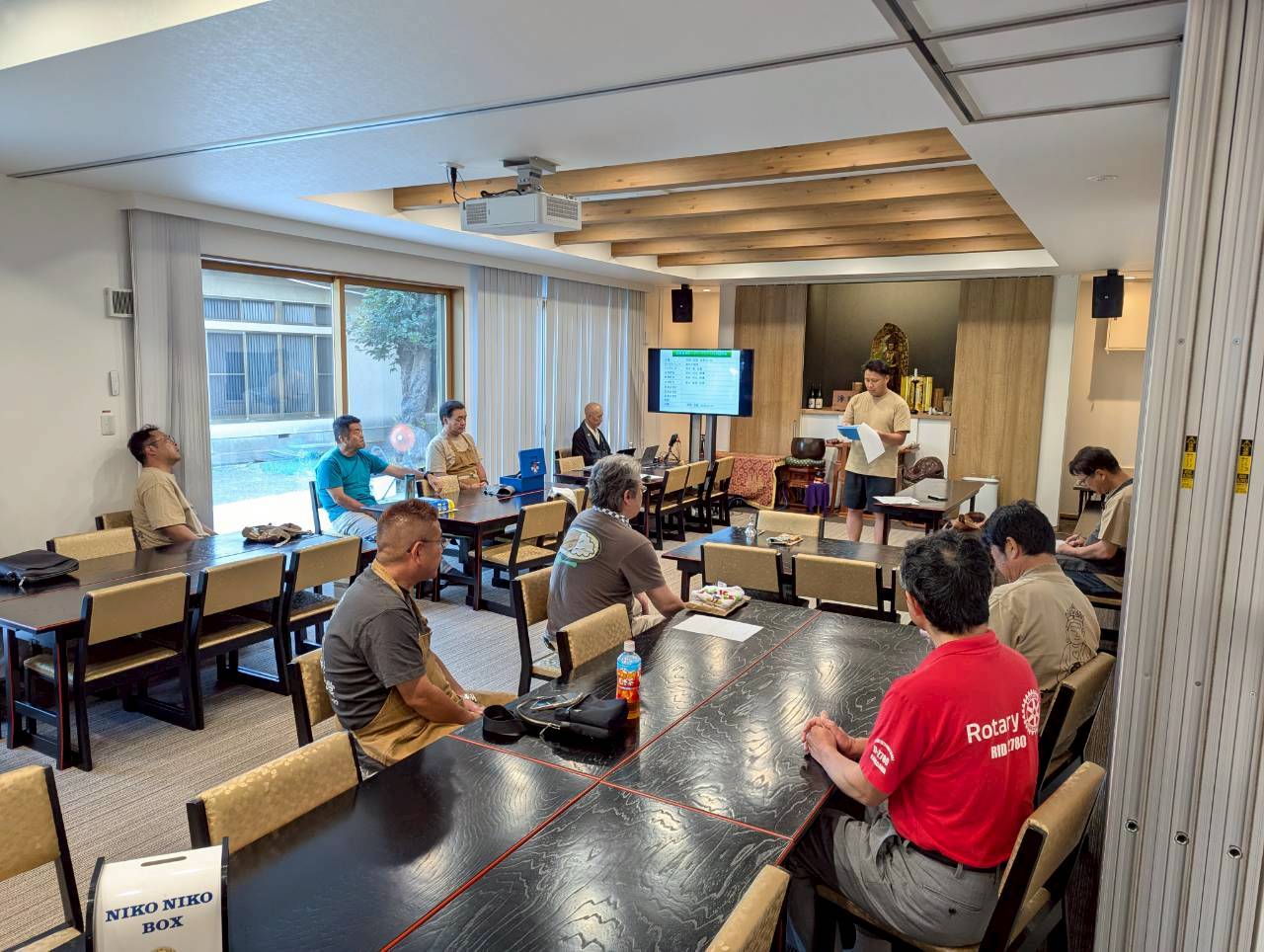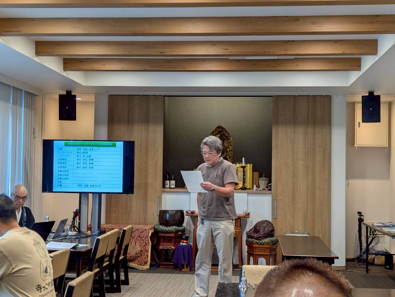 昨日、第4グループの会長幹事会が開催されましたので、その内容を含めてご報告させていただきます。本日はお忙しい中、国際ロータリー第2781地区第4グループガバナー補佐の大箭 剛久様にお越しいただいております。ありがとうございます。まず、ガバナー公式訪問は10月8日に予定されており、その1週間前の9月24日の例会にはアシスタントガバナーの訪問があります。通常の例会会場にお越しいただきますので、よろしくお願いいたします。続いて、地区大会についてですが、9月6日・7日の2日間開催されます。活動計画書には誤って「9月7日 レンブラントホテル厚木」と記載されておりますが、正しくは2日目の9月7日は伊勢原文化会館での開催となります。アクセスがやや不便な会場ですので、乗り合わせやタクシーのご利用をご検討ください。この地区大会は振替例会となり、クラブ全体で半数以上の出席がない場合は振替扱いが認められず例会が成立しませんので、やむを得ない事情を除き、ぜひご参加くださいますようお願いいたします。また、当日はクラブセットを使ってオンライン接続を行います。インターネット環境は整っている予定ですが、事前に確認いたしますので、準備へのご協力をお願いいたします。さらに、例会前に幹事との打ち合わせを約30分、その後に最大60分の協議会を行います。基本的には理事の皆様にご参加をお願いしておりますので、どうぞよろしくお願いいたします。